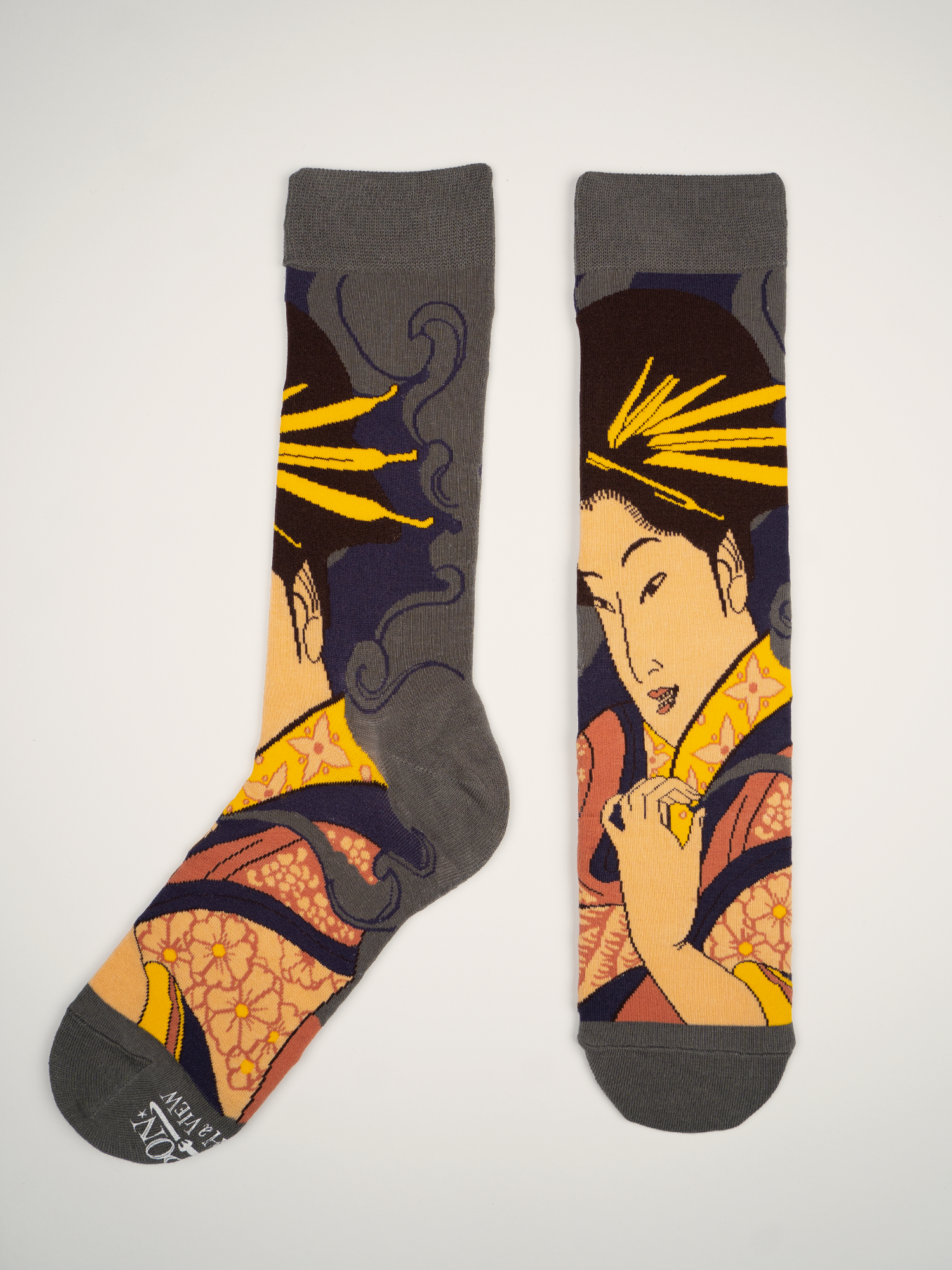 The beautiful and classic Japanese Geisha in a quiet and comfortable color scheme to throw on your feet. The lady of arts and conversation will accompany you on your travel through life. These high quality comfortable cotton socks will entertain your feet, Japanese style.