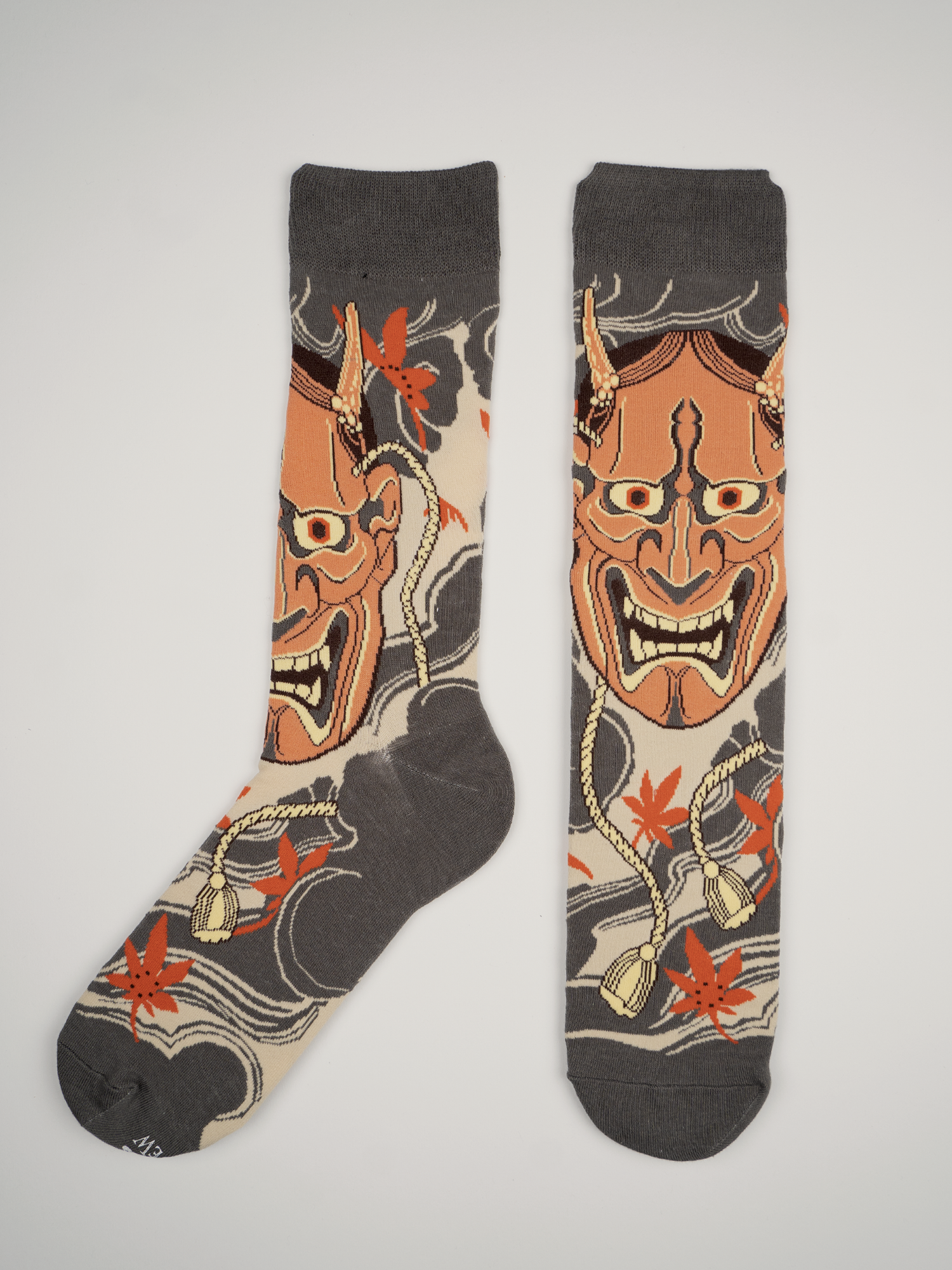 Hannya the jealous female demon seen in Noh theater is loved by traditional tattoo fans, art enthusiasts and travellers of Japan. A quiet but colourful color combination makes these socks perfect for casual and business attire. High quality cotton socks that are perfect for everyone, Hannya is a classic.