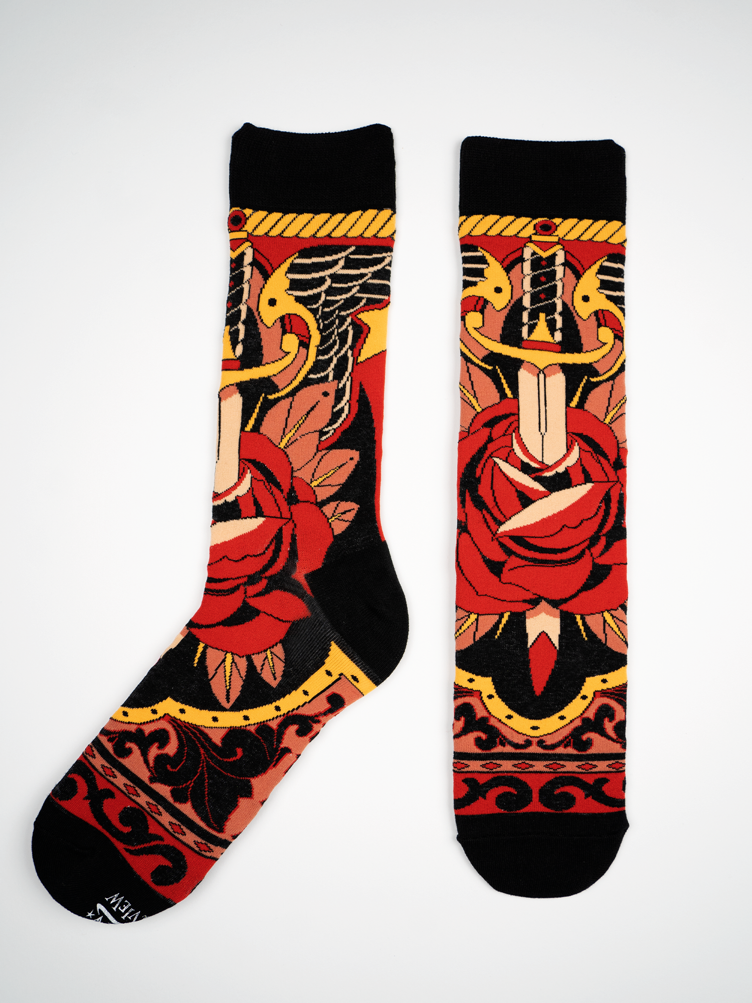 Classic tattoo design of roses and daggers, one of the coolest designs out there. Nothing beats roses and daggers for style and charm. High quality cotton socks.