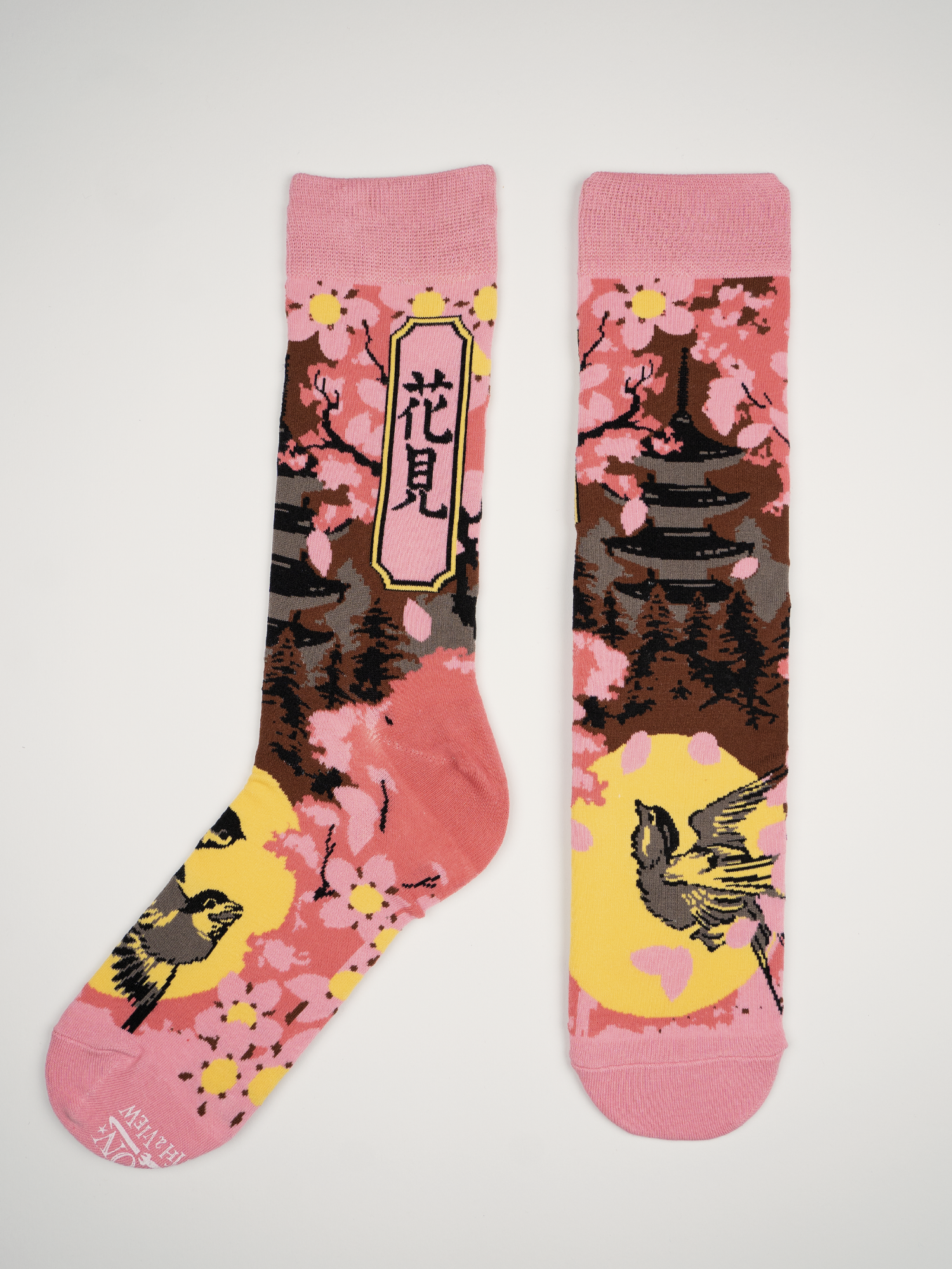 Japanese temples and swallows, what could be better? These bright and happy cotton socks will bring comfort to all who wear them. Decorated with cherry blossoms each of the socks is different, two birds on the left and one on the right.......or is it reversed? You decide.